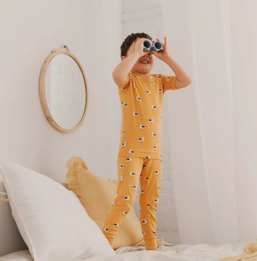 These playful PJs are perfect for a family vacay to the coast. Featuring a short-sleeved top and long pants, the 2-piece set will keep them just the right temperature on Spring nights. The set is printed all over with our ‘seagulls’ print and made from an organically grown cotton jersey. Matching ‘Seagulls’ items are available for smaller siblings, too.