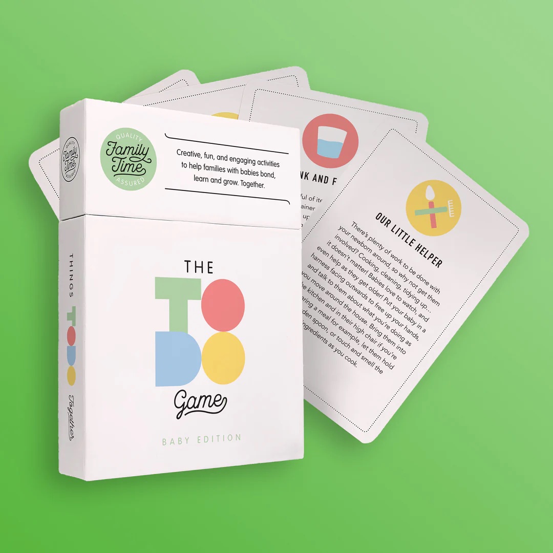 The ToDo Game Baby Edition is a box full of inspiration for parents wanting to bond and spend quality time with their newborn! With a focus on fostering parental bonding, stimulating sensory play and gross and fine motor development, The ToDo Game Baby Edition is a simple, smart parenting tool to help babies learn, grow and begin to know and love the world around them.