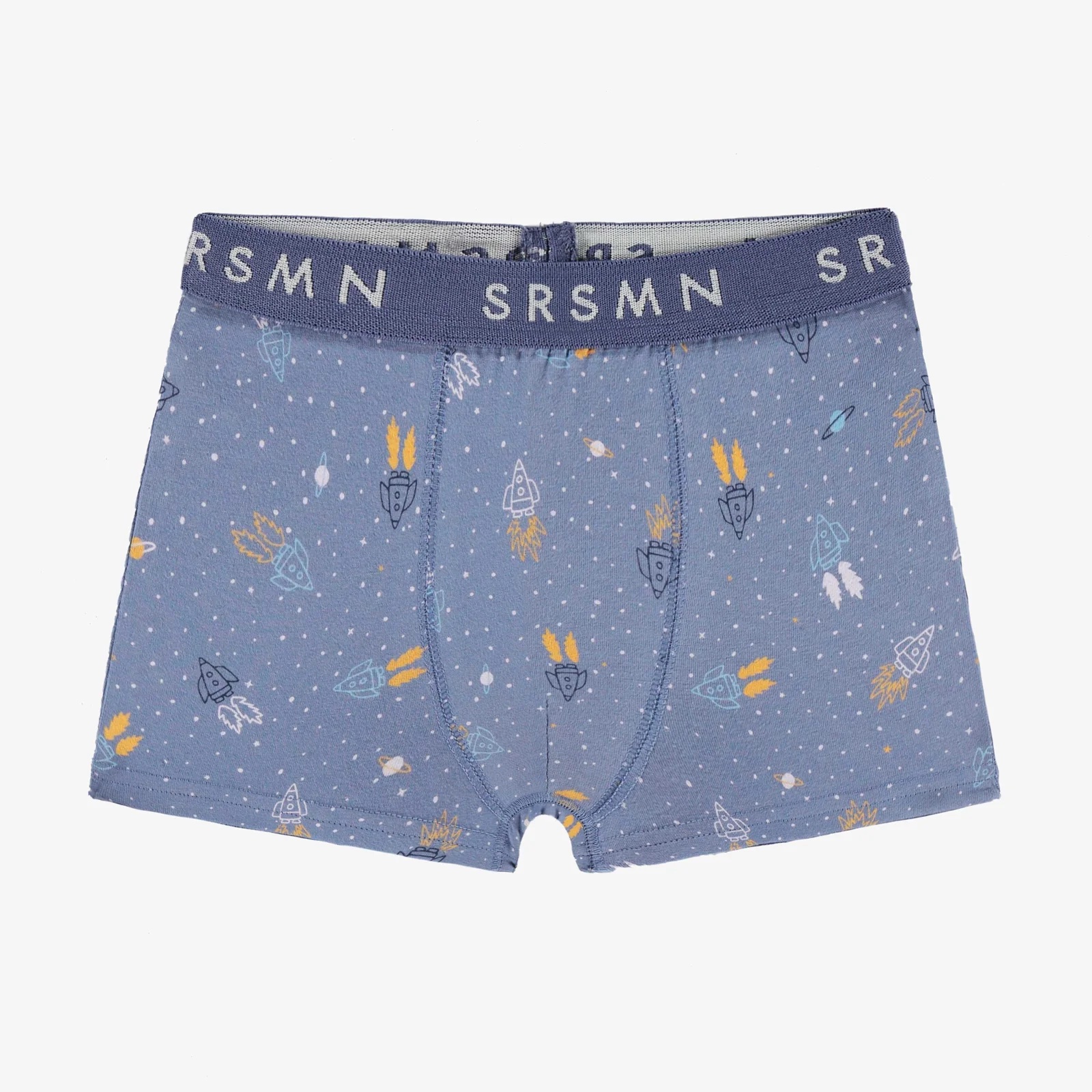Blue boxer shorts with rocket and star patterns. Made from skin-friendly stretch cotton jersey.