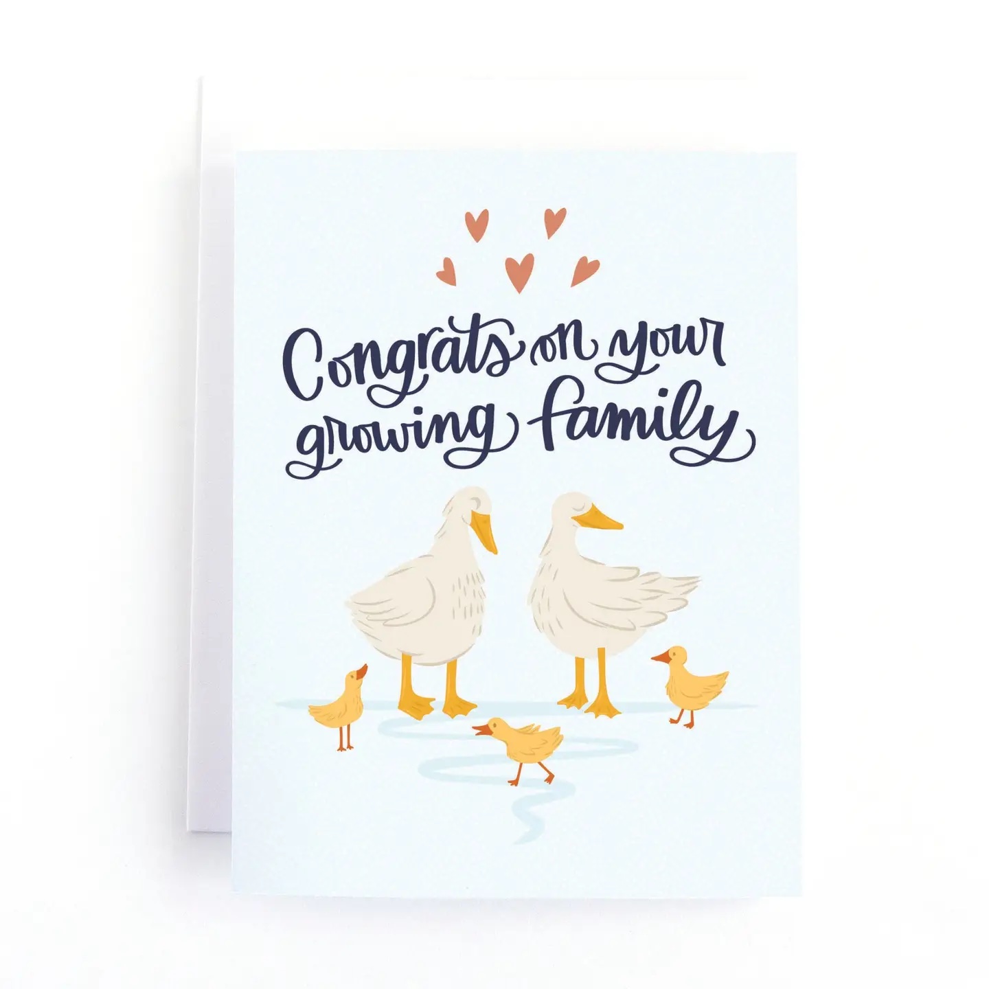 Welcome to the nest! Our sweet new baby card features an adorable illustration of a proud mother and father duck with their charming ducklings. It's the perfect way to celebrate the arrival of twins, triplets, or even quadruplets! Whether it's for a baby shower or to simply spread some joy to new parents, this card is sure to bring smiles and warm wishes to the growing flock. It's a delightful reminder that their family is now filled with even more love and quirkiness!