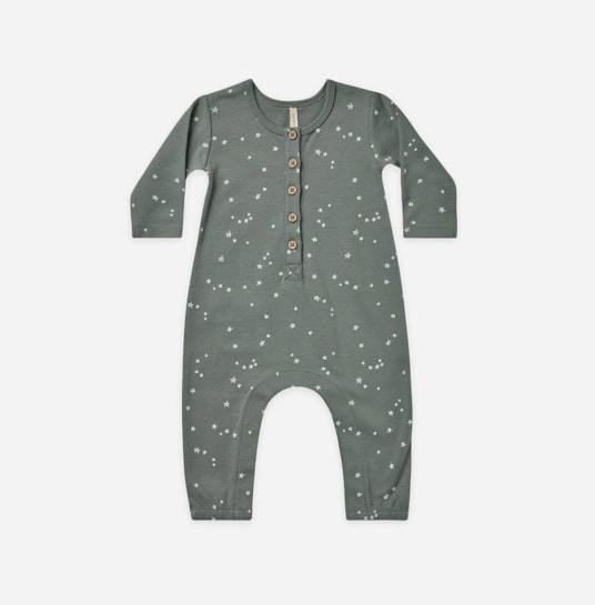 Velvety soft long sleeve jumpsuit with coconut buttons down the chest, and hidden snaps along the inseam for easy changing.