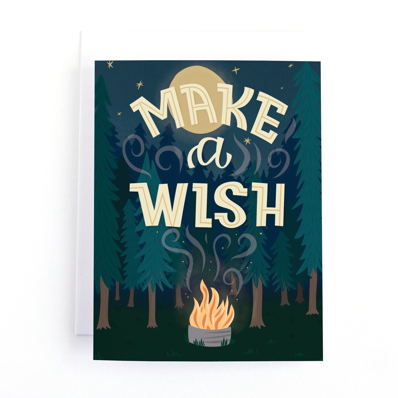 Celebrate a birthday with a spark of adventure! This hand drawn camping-themed card features a cozy campfire in the woods, with the moon and stars twinkling above and the cheerful message “Make a Wish.” Perfect for outdoor lovers, mountain explorers, and forest wanderers, it’s a fun way to bring a bit of the great outdoors to their special day. A great addition to any gift for those who feel most at home under the night sky!