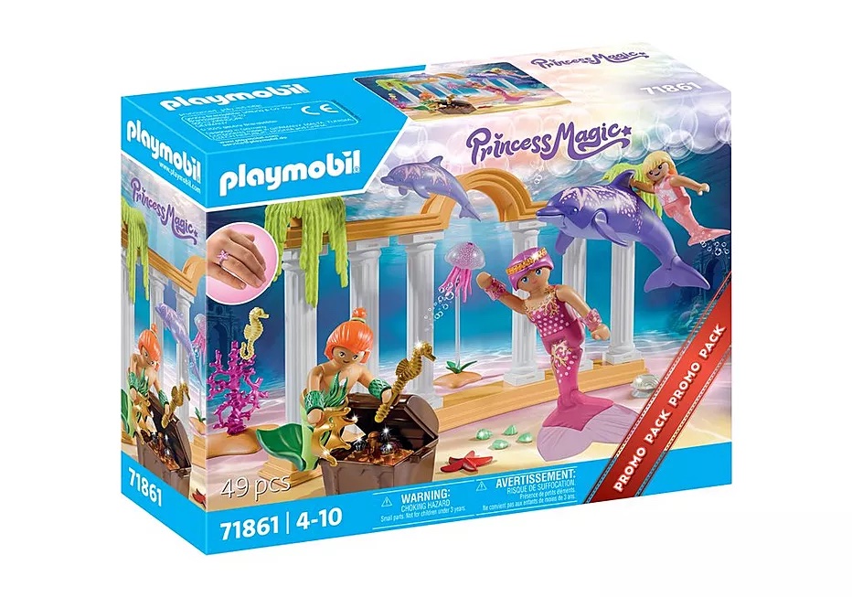 Explore the wonders of Atlantis to discover the Mermaid Treasure. Under the ocean surface awaits another world filled with purple dolphins, jellyfish lamp,s and regal columns for you to swim through. See if you can find the treasure chest filled with wonders. Set includes two adult mermaids, one child mermaid, adult dolphin, baby dolphin, column, seaweed, treasure chest, and other accessories. Recommended for ages four to ten years. Warning. Choking Hazard. Small Parts. Not for children under 3 years