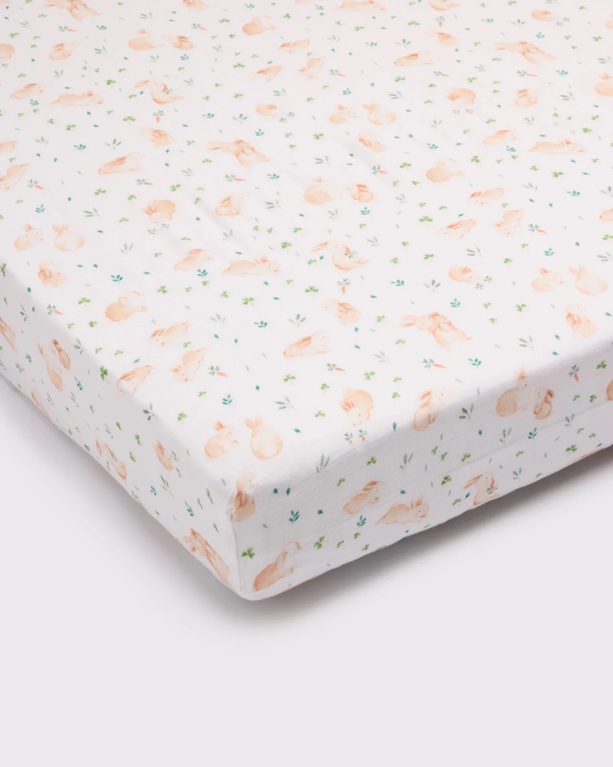 The ultimate fitted crib sheet designed for sweet dreams. Designed to fit all standard crib mattresses, our super-soft muslin crib sheet is made with breathable bamboo cotton fabric at an Sustainable Production certified factory. So not only is it gentle on the baby's delicate skin, but you can also feel confident it's safe and of high quality. And because we're eco-conscious and all about the details, it comes packaged in a reusable, matching drawstring bag for easy storage and transport.