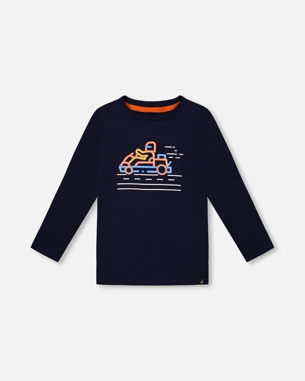 Colourful karts add super cute charm to our navy graphic tee. Made from soft and stretchy organic cotton, this tee has long sleeves, a crew neck, and a large print on the chest. It pairs perfectly with all the bottoms and hoodies from our Formula 1 collection!