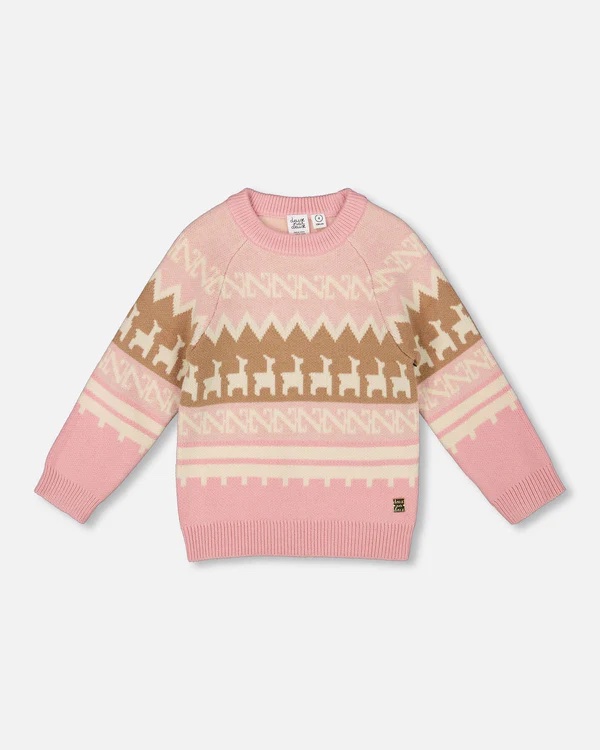 Our dusty rose llama jacquard knit sweater adds a playful touch to winter outfits. This soft sweater features long raglan sleeves, ribbed trims, and a fair isle jacquard pattern adorned with tiny llamas. Crafted from a warm, stretchy knit, it pairs perfectly with any skirt, pants, or leggings this season.