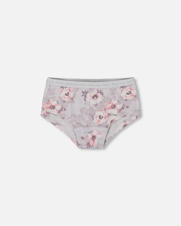 Our pale pink floral print boyshorts on a neutral lilac background made from organic cotton are a must-have for every little girl's wardrobe. Ultra-soft and stretchy, these briefs feature a pretty all-over floral, cloud, and rainbow print with a comfortable silhouette and an elastic waistband printed with the brand's logo.
