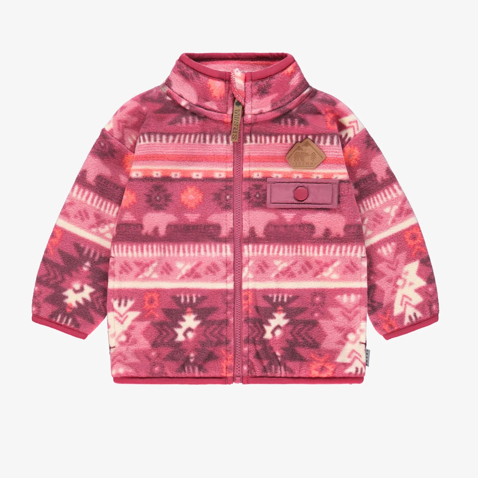 Pink fleece jacket, perfect for colder days. Features a zipper with a chin guard for easy dressing.