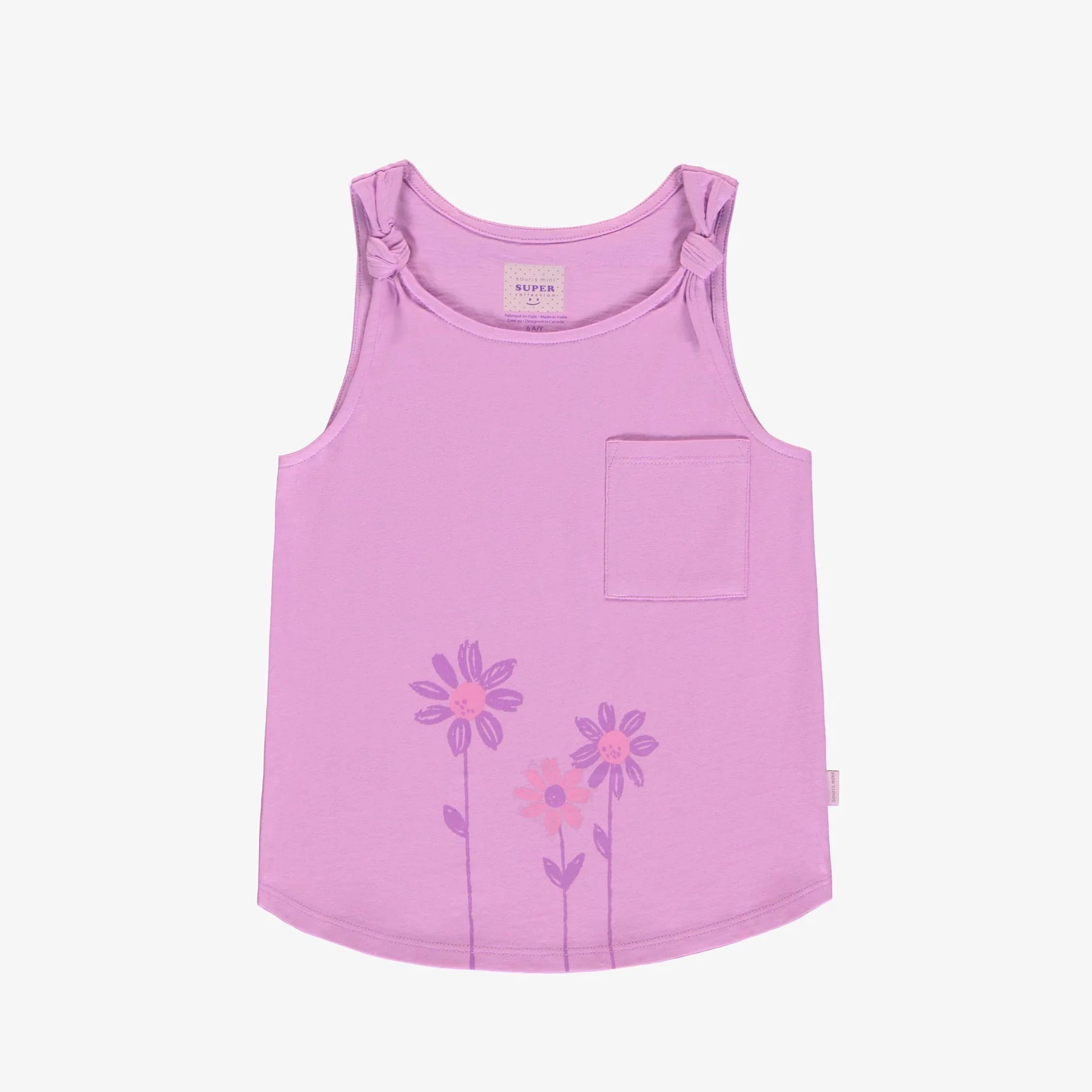 Purple camisole with knotted straps, slim fit, round neckline, rounded bottom, with pocket, in 100% cotton.