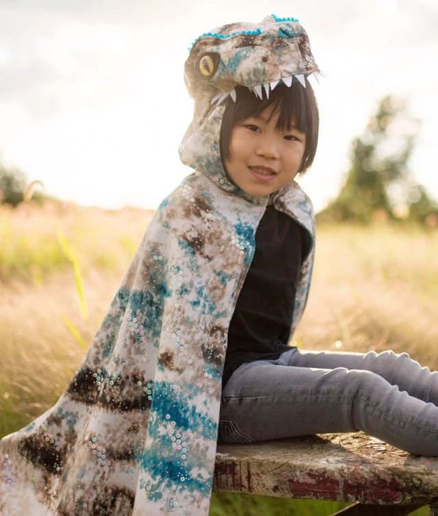 Featuring a hand-dyed teal & brown fabric, and heat-sealed sequins, Great Pretenders' new Raptor Cape is a great addition to any dinosaur lover's collection! The cape is lightweight and soft to the touch, making it easy to wear for a long time. The hood is made of a stiffer material to hold its shape, and the cape attaches to the back with a Velcro closure. The cape is lined with a beautiful rich teal satin & finished with realistic, vibrant green eyes!