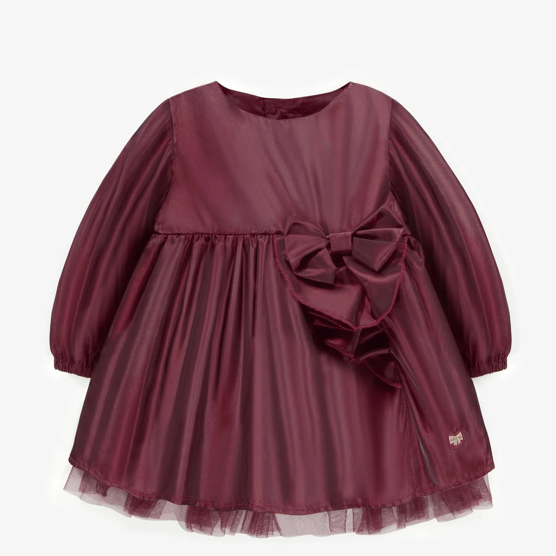This red long-sleeved taffeta flared dress is absolutely sublime and has a tulle underskirt for added volume.Your minis will look their best in this dress. Notice the silky material, the colour of a deep red and the beautiful buckle on the oversized front adding chic and style.