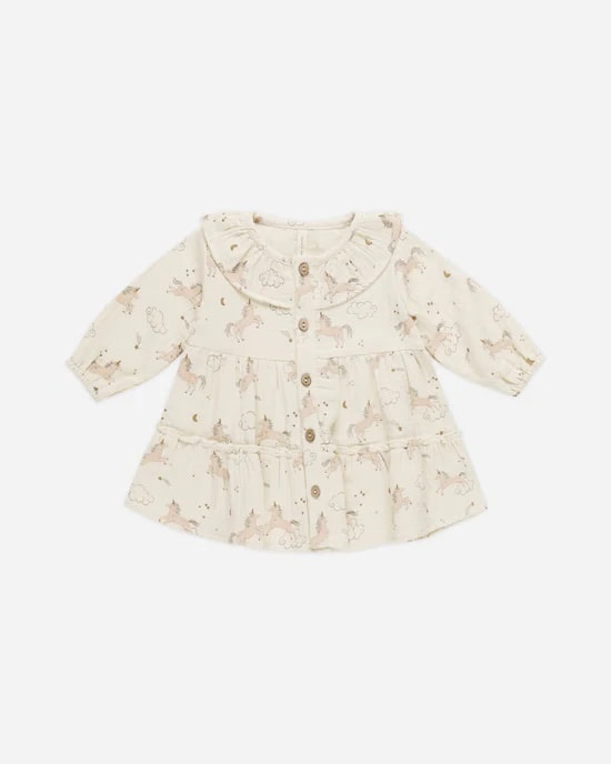 Soft baby dress with tiers, long sleeves, and cute ruffled collar along the neck. It snap buttons along the center front for easy changing as well also. All baby sizes includes our gathered bloomers!