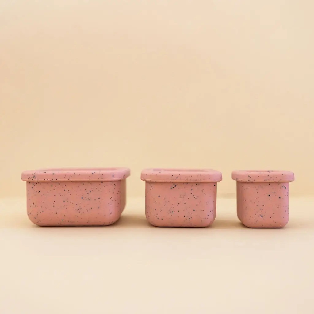 Snack set with lid. Food grade silicone. BPA free. Easy to wash in the dishwasher or with soap and damp cloth. Microwave and freezer safe. Pack of 3.