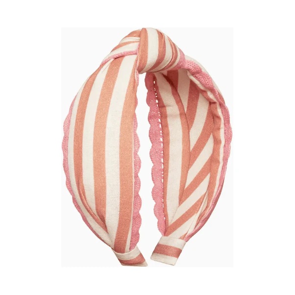 Our stripy knotted headband is made from the softest brown fabric, and is edged with a pink scalloped trim. It features a twisted knot and is made for a comfortable fit for little heads!