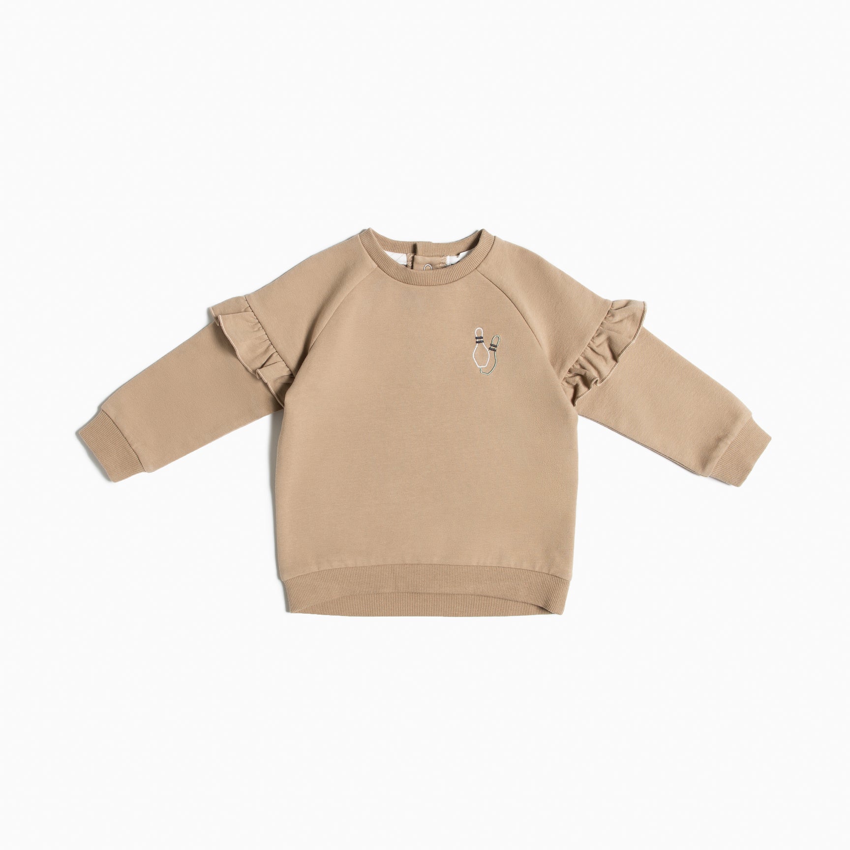 Everyone can get on board the bowling team with coordinating sweaters. This baby girl’s sweater features ruffle details on either sleeve for a girly style, and a bowling pin motif. Snap buttons at the back of the sweater make for easy over the head changing, while the elasticated cuffs and waistband are designed with comfort in mind.