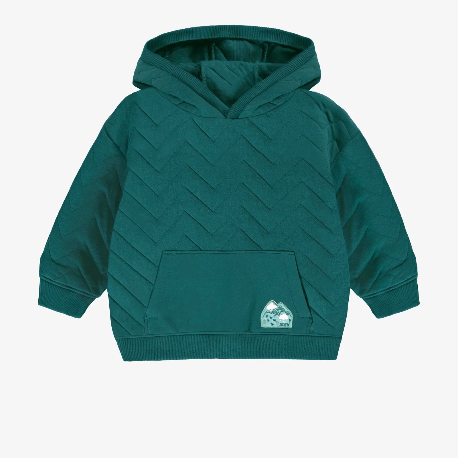 Teal blue sweater in comfortable quilted jersey. Features a hood and a large kangaroo pocket. The bottom of the sweater and cuffs are ribbed for a better fit.