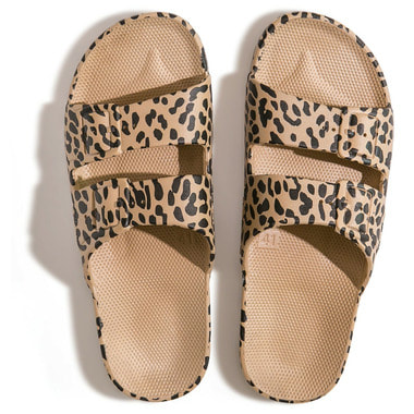 Waterproof Slides are vegan and recyclable slides that are injected with air and feature double wide crossover straps with faux buckles.